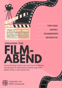 Neue Veranstaltungen des KDFB für das Jahr 2026 Alle Termine sind den jeweiligen Flyern zu entnehmen. Infoveranstaltung für Frauen zur Kommunalwahl in Schwarzach Stadt ° Licht ° Genuss – Ausflug nach Regensburg Filmabend im Pfarrheim Schwarzach Sie möchten mehr über den KDFB erfahren. Dann klicken Sie bitte hier.