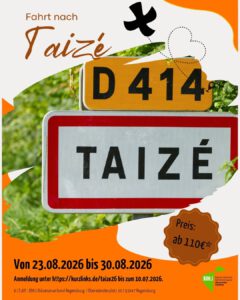 Der BDKJ-Diözesanverband Regensburg lädt Jugendliche und junge Erwachsene zur Taizéfahrt vom 23. bis 30. August 2026 ein. Taizé ist ein kleiner Ort in Frankreich, in dem sich jedes Jahr tausende junge Menschen aus der ganzen Welt treffen. Gemeinsame Gebete, die bekannten Taizé-Gesänge, Austausch über Glaubens- und Lebensfragen sowie internationale Begegnungen prägen diese besondere Woche. Taizé … [weiterlesen…]