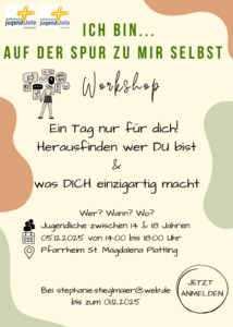 Kurz zu uns:Wir sind vier Studentinnen der Technischen Hochschule Deggendorf aus demStudiengang Soziale Arbeit im 3. Semester und freuen uns, im Rahmen unseresPraxisprojekts einen Workshop zum Thema „Persönlichkeitsentwicklung – Ichbin… auf der Spur zu mir selbst“ anzubieten. Gemeinsam mit der Katholischen Jugendstelle gestalten wir diesen Tag fürJugendliche zwischen 14 und 18 Jahren, die Lust haben … [weiterlesen…]