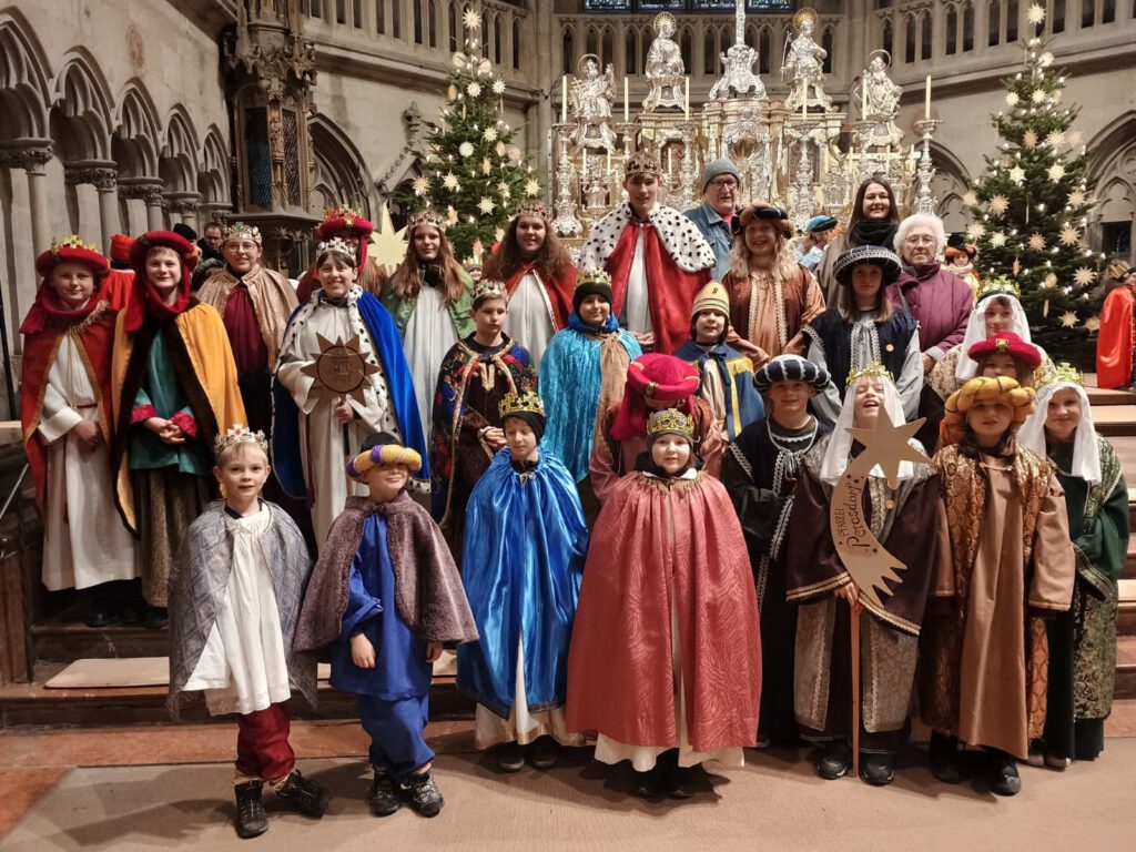 In der Mädchenrealschule Niedermünster durften wir uns alle in Schale werfen um dann von dort aus in einem Zug zum Dom zu ziehen, wo Bischof Rudolf einen feierlichen Gottesdienst feierte und alle Sternsinger segnete. Wir hatten dieses Jahr besonders viel Glück, denn unsere Sternsinger durften, weil die Bänke bereits alle belegt waren, im Altarraum Platz nehmen, sodass wir ganz nah am Bischof sein konnten