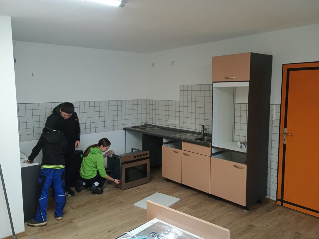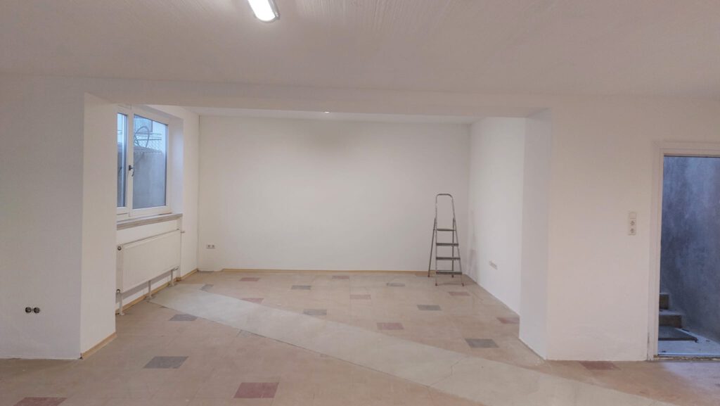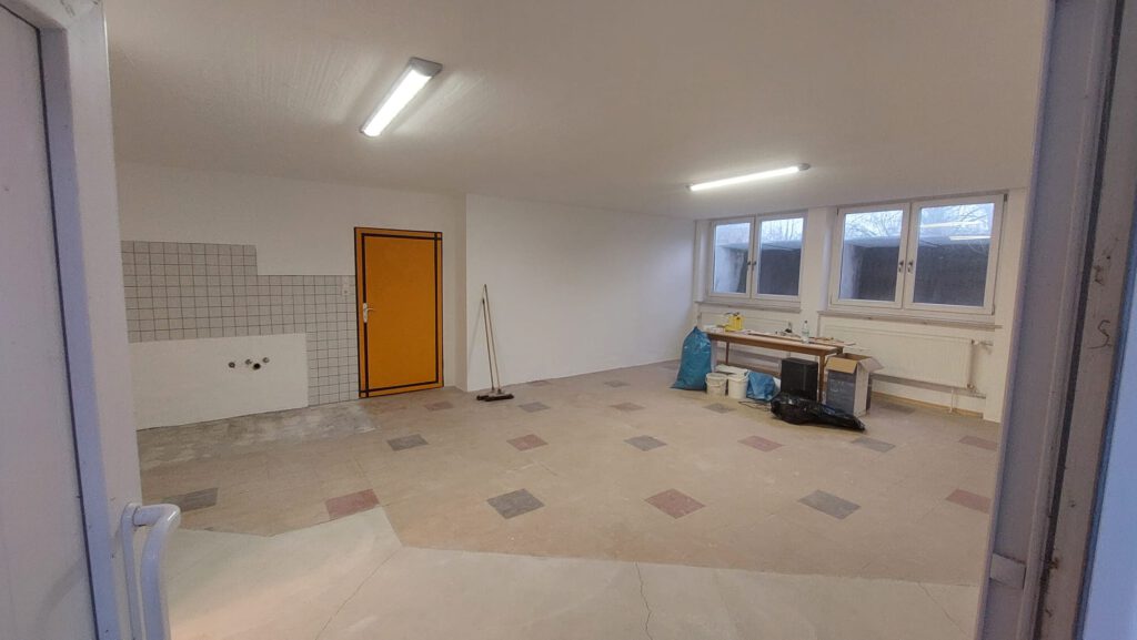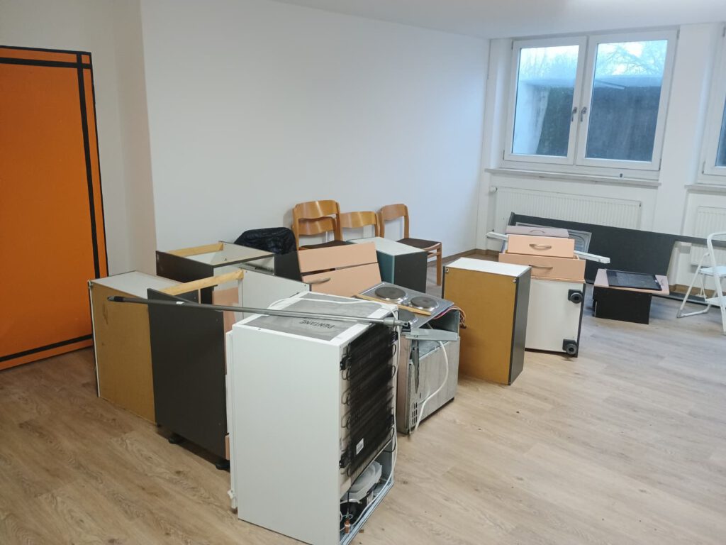 Seitdem ist der Raum nun ausgeweißt worden, eine Küchenzeile wurde installiert und einige Zwischengelagerte Möbel, die meisten davon aus dem Nachlass von Pfr. Dirscherl, fanden bereits ihren Weg in den Raum. Außerdem würde schon eine Grundreinigung durchgeführt.