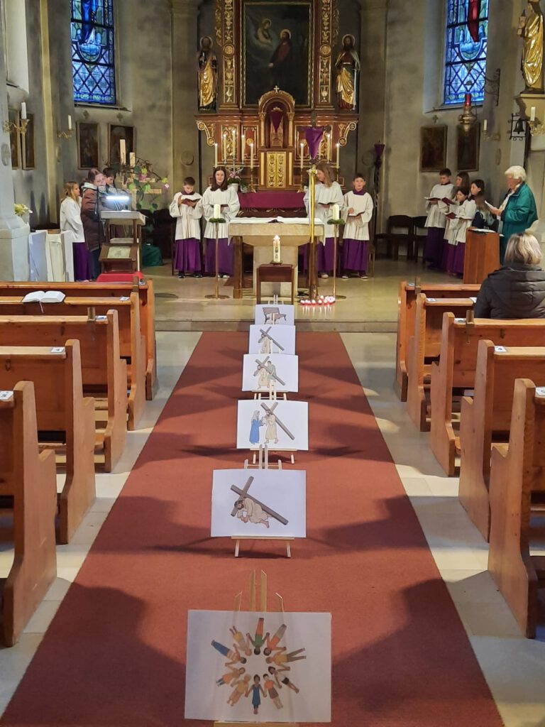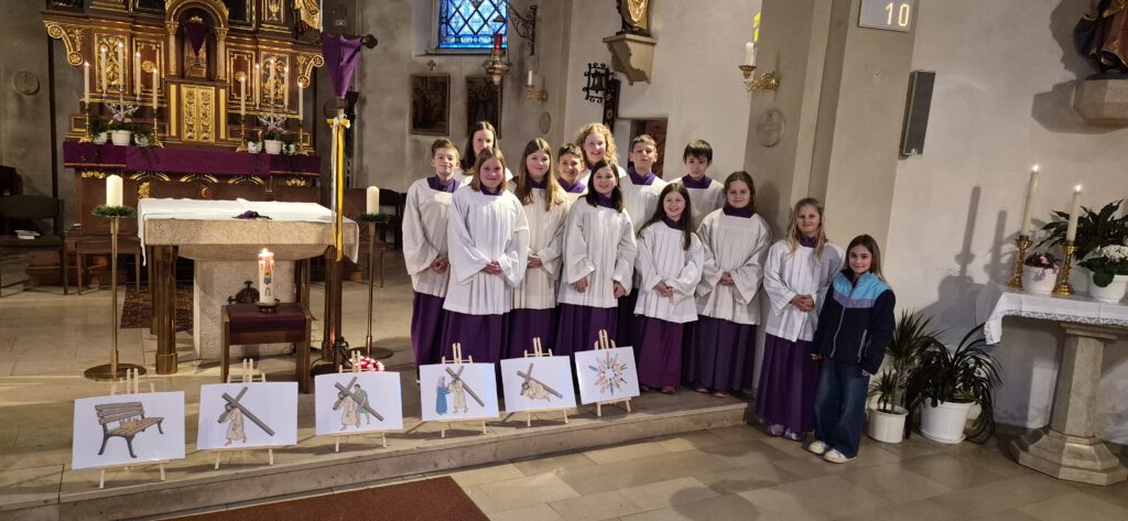 Die Kinder übernahmen dabei eigene Abschnitte, die sie mit Texten, Gebeten und kleinen bildlichen Darstellungen lebendig gestaltete. So entstand ein abwechslungsreicher Kreuzweg, der die Besucher zum Nachdenken und Mitfühlen einlud. Mit dem entzünden kleiner Kerzen durften die Kreuzwegbesucher ihre Anliegen in Stille vorbringen.